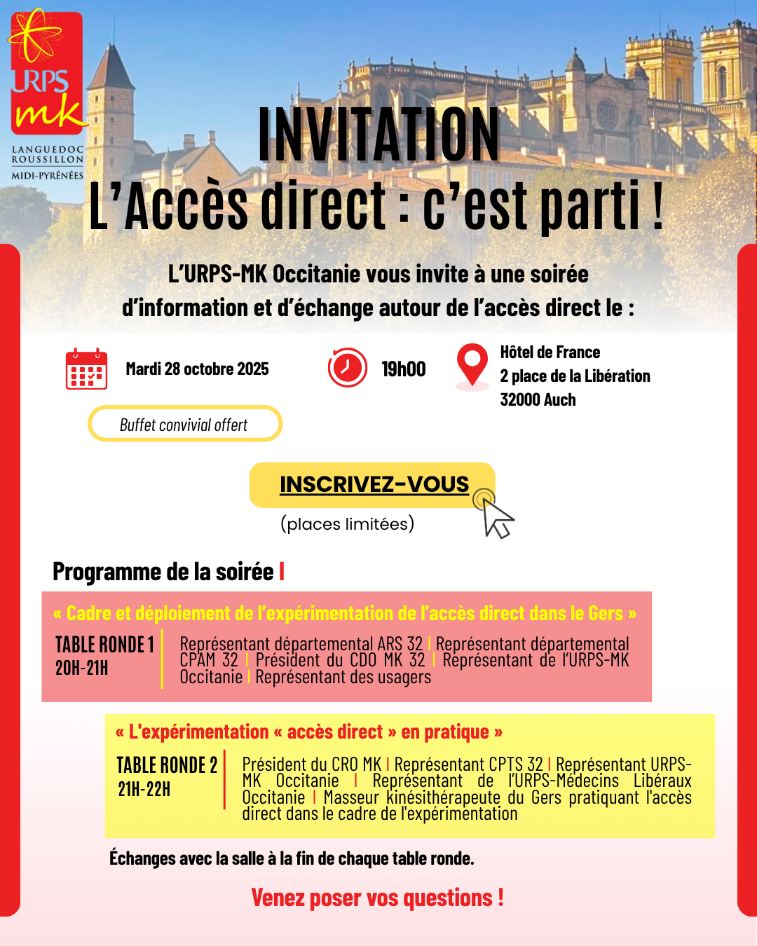 Patrick Saut, président de l’URPS MK Occitanie et l’ensemble des élus URPS vous donnent rendez-vous pour une soirée exceptionnelle, imaginée et conçue pour les kinés du Gers concernés par l’expérimentation nationale, désormais active et autorisant, sous certaines conditions, les masseurs-kinésithérapeutes membres d’une CPTS, à recevoir leurs patients en accès direct sans prescription médicale.